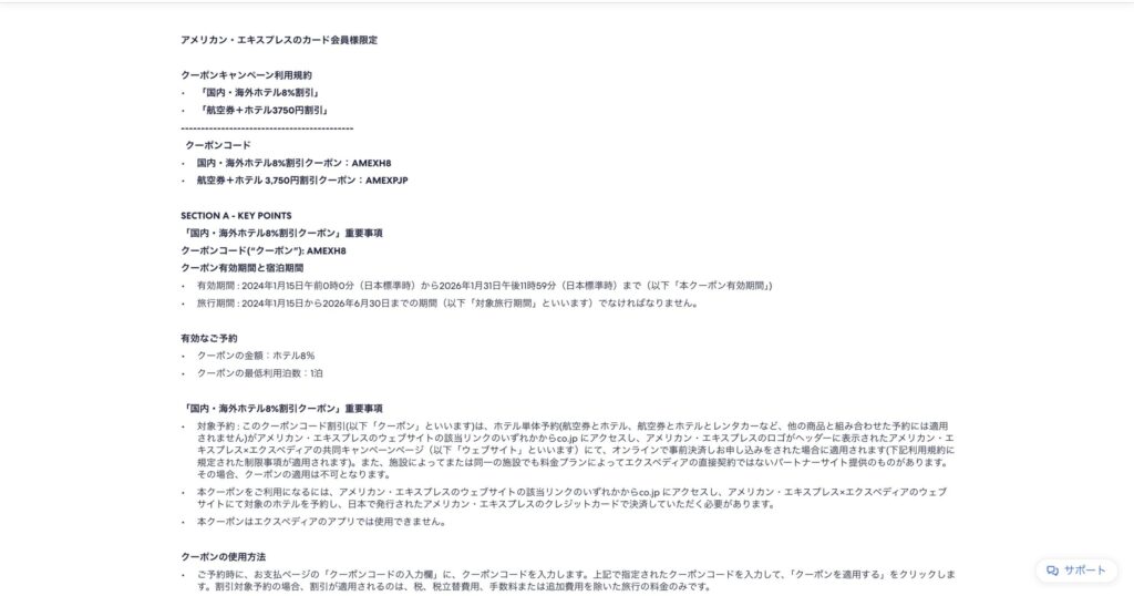 以下は、2026年1月時点でエクスペディアが配布している割引クーポンコードになります。