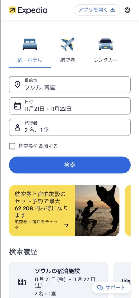エクスペディアを通して日本国内及び海外のホテルを予約すると8%の割引になり、航空券&宿泊のプランでは2,500円オフの料金で予約できます。